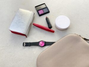 ティッシュ、ウェットシート、ミラー付きポーチ、化粧直し用のアイテム、香り控えめのコスメなどをまとめておくと安心です。